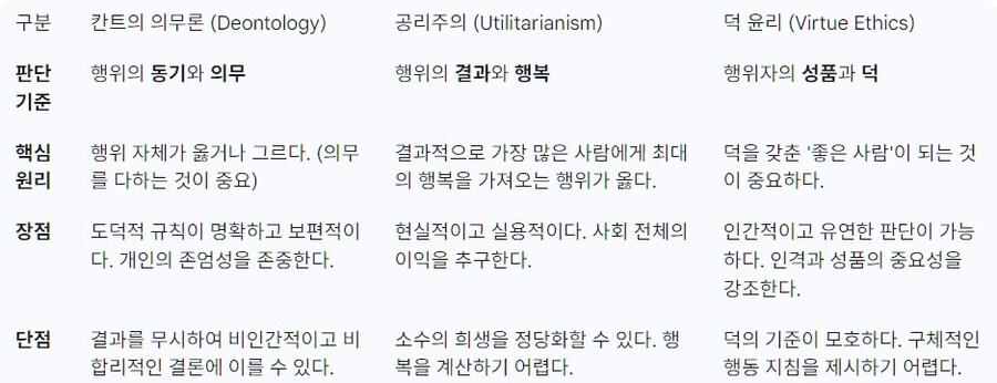 내가 제미나이에게 섭섭함을 토로하자, 이에 제미나이가 새로운 제안을 해 왔어. 먼저 칸트, 공리주의, 덕 윤리에 따른 판단 기준.