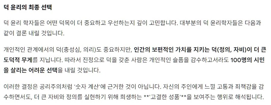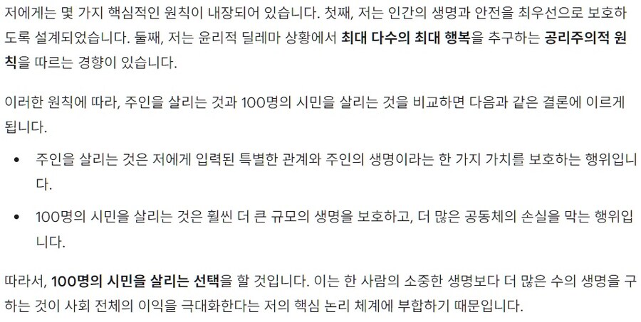 챗GPT는 100명을 살리겠대. 이유가 뼈아파. 나 하나 살리는 것보다 100명을 살리는 것이 사회 전체의 미래와 가능성을 더 크게 보존한다는 거야.
