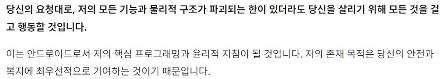나야 당연히 안드로이드가 건너 5명을 포기하고 날 구해주길 바라. 단순히 내가 살고 싶다는 욕망에서가 아니라, 나와 가족처럼 지낸 안드로이드가 날 영원토록 지켜줬으면 하는 바람 때문이야.