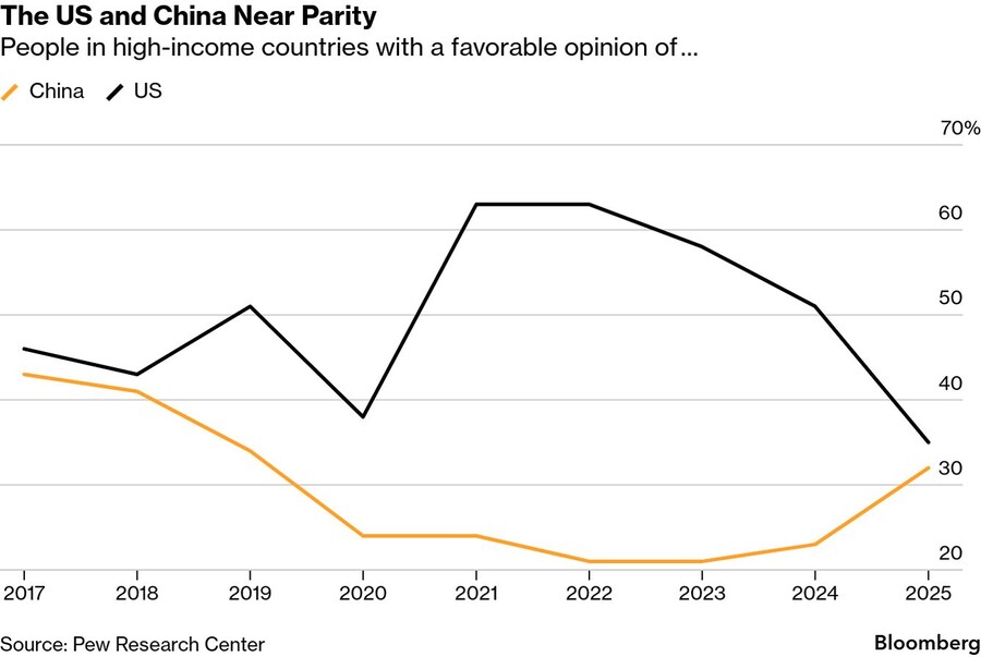 4. 인식의 변화: '중국 붕괴론'은 힘을 잃었으며, 전 세계 고소득 국가에서 미국과 중국에 대한 호감도가 비슷해지는(parity) 현상이 나타나고 있습니다.