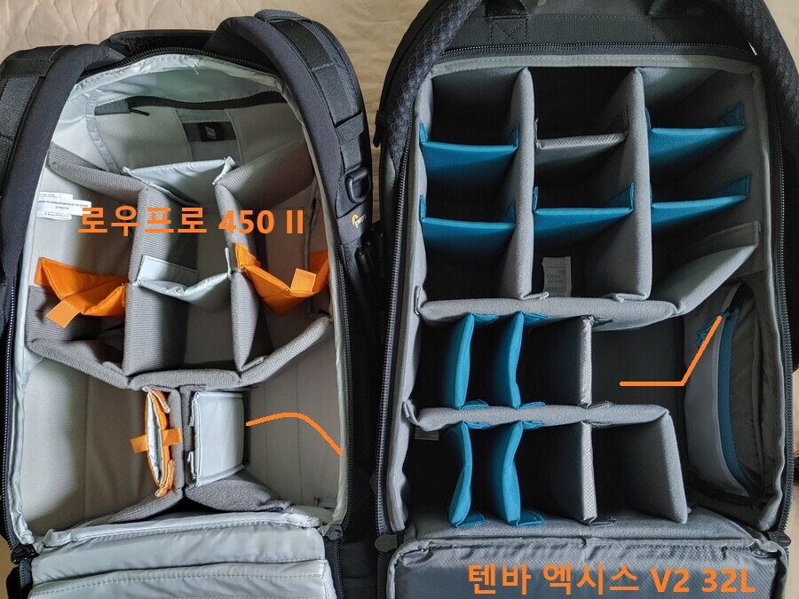오른쪽 텐바 엑시스 V2는 가방 모서리가 전체적으로 직각직각해. 가방 테두리 부근까지 꽉꽉 장비를 채울 수 있어. 반면 AW2는 윗면 옆면 가릴 것 없이 둥글둥글하다 보니 손해 보는 공간이 커.
