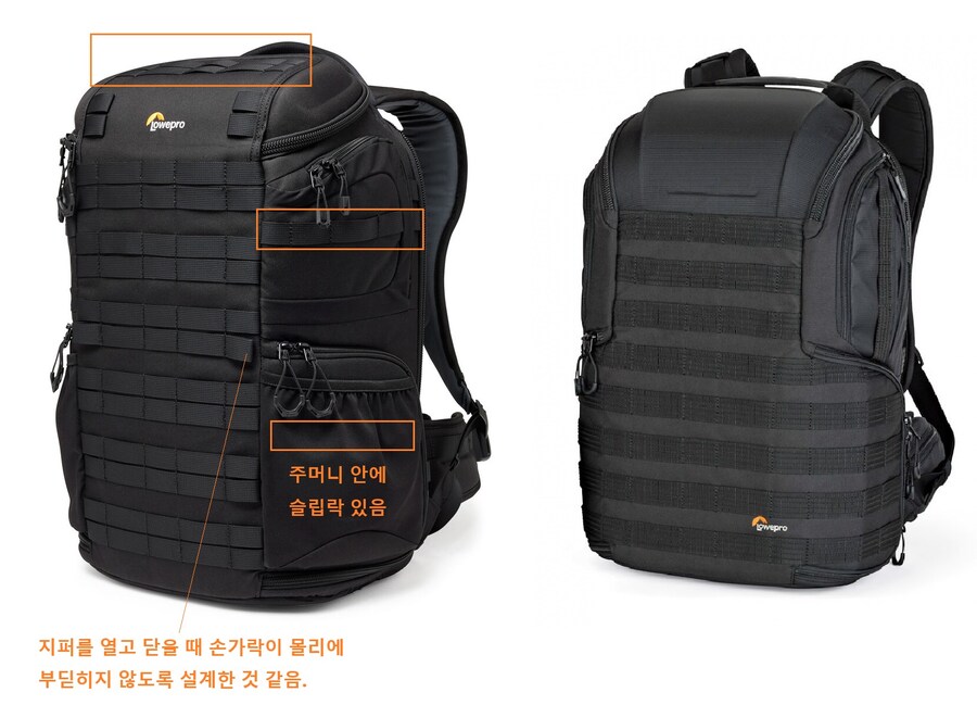 텐바 엑시스 V2는 가방 겉면에 별도의 수납공간이 있어. 노트북 또한 가방 본체를 열지 않아도 바로 꺼낼 수 있지. 그런데 로우프로 AW3, AW2는 상대적으로 외부 주머니가 부족해. 그야 이들 배낭은 몰리 주머니를 통해 부족한 외부 주머니를 보충할 수 있지만, 아무래도 몰리 보조 가방은 일체감 및 안정감이 부족하니까. 아쉽습니다.