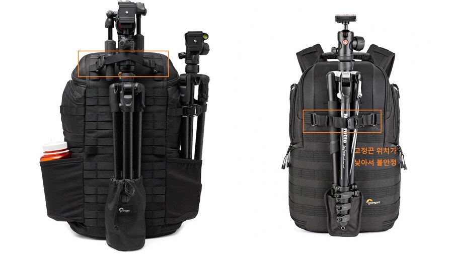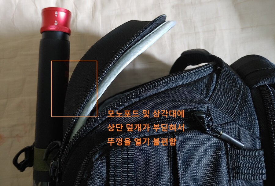 가방 뒷면에 모노포드나 삼각대를 결착했을 때, 뚜껑이 봉에 부딪혀서 상단 입구를 제대로 열 수 없었거든. AW3는 뚜껑 가로막힘 문제를 피할 수 있을 것 같아.