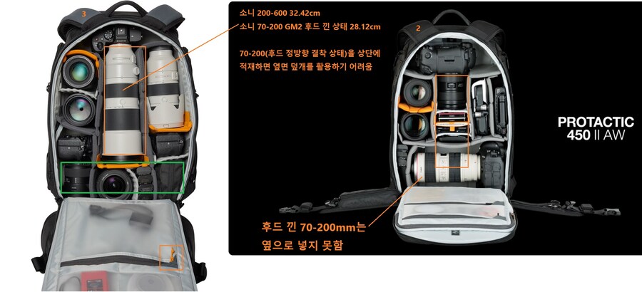 소니 70-200 GM2 후드 낀 상태에서 길이가 28.12cm이고, 이는 AW2, AW3 가릴 것 없이 측면 입구로는 수납이 불가능해. 그러니 남은 방법은 상단 입구로 넣어야 하는데, 이럼 가운데 비워두어야 할 공간이 거의 가방 밑단까지 닿아.