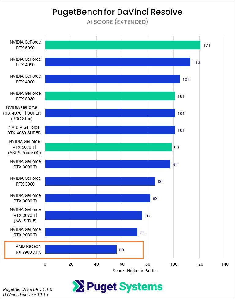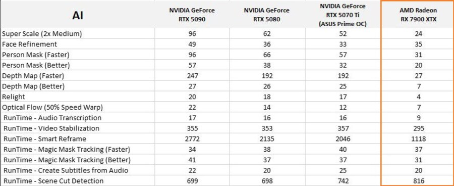 라데온 최상위 7900 XTX 조차 바닥에서 놀고 있지. AI 점수 때문에 나는 라데온을 결코 다빈치 리졸브용으로 쓰지 말아야 한다고 생각했어.
