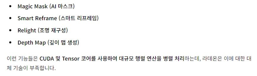 그런데 오늘 AI 항목 상세 점수를 살펴봤더니, 그간 라데온을 향한 내 아집이 틀렸을 수도 있겠더라고. 라데온이 특정 측정 항목에서 너무나 점수를 깎아먹기 때문에, 그래서 전체적으로 AI점수가 형편없는 거였어.