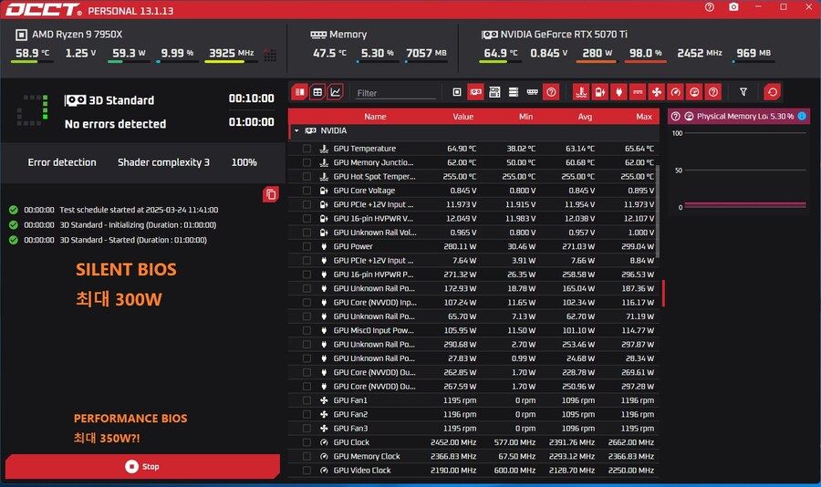 참고로 Performance나 Silent나, 전력제한 350W로 동일하고, 부스트클럭 역시 2588mhz로 똑같습니다. 무슨 차이가 나는지 모르겠습니다. 전압 그래프가 다를까요? 기가바이트 홈페이지를 둘러봤으나 퍼포먼스와 사일런트 바이오스간 무슨 차이가 나는지, 설명을 찾을 수 없었습니다.