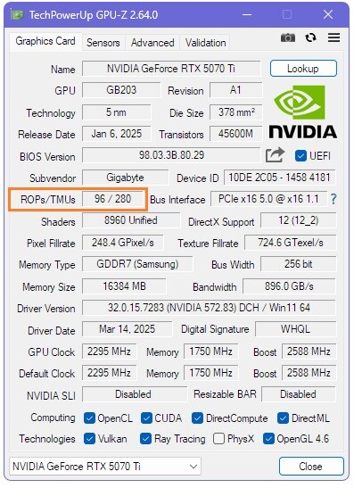 ROPs 확인. 5070Ti는 96개. 정상입니다. (간혹 ROPs가 부족한 제품이 있다고 해서 확인)