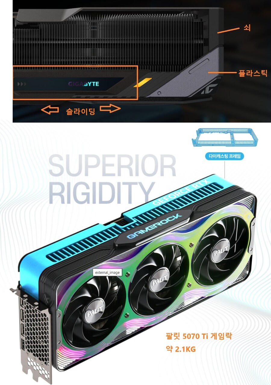 번외로 팔릿 5070 Ti 게임락은 2.1KG로 게이밍 보다 0.3KG 더 묵직합니다. 추측으론 두 제품 방열판 면적과 무게는 대동소이 할 것 같습니다. (팔릿 게임락 크기 : 332 x 150 x 70). 대신 게임락은 옆면에 금속 테두리가 있어서 무게가 더 나가는 것 같습니다.