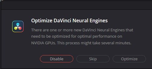 Optimize Davinci Neaural Engines. 문구가 뜹니다. 최적화를 하더라도 해당 문구가 다빈치 리졸브를 실행시킬 때마다 계속해서 뜹니다. (최적화를 매번 다시 수행함)