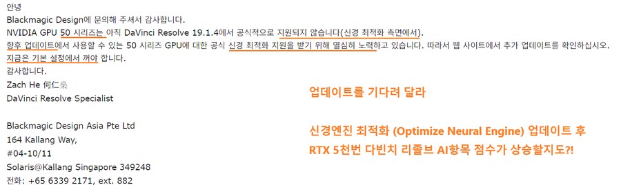 다빈치 리졸브 19.1.4는 아직 엔비디아 5000번 신경 최적화를 지원하지 않는다.