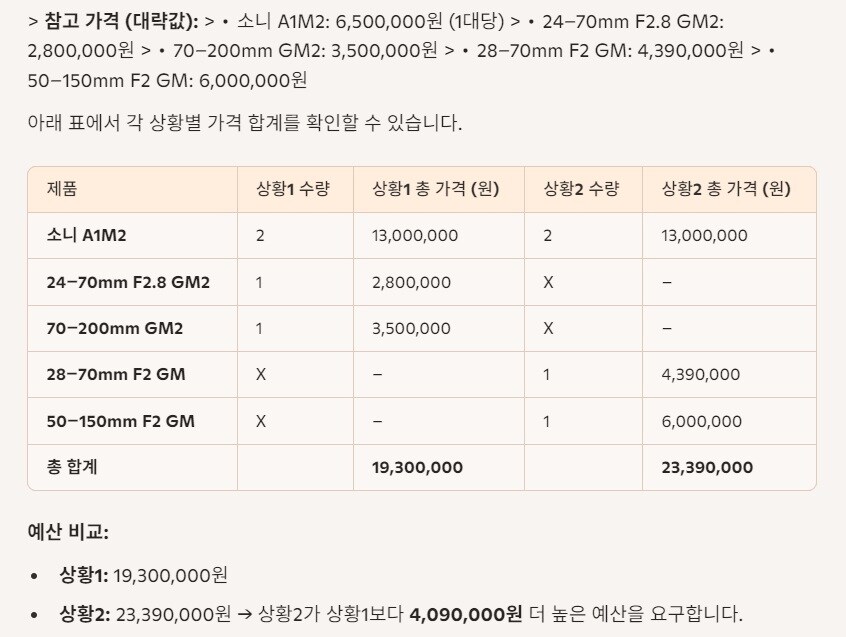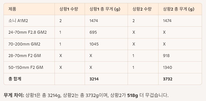 끝으로 24-70GM2, 70-200GM2, a1m2 2대 구성. 28-70GM, 50-150GM, a1m2 2대 구성 무게를 비교해 봤어.