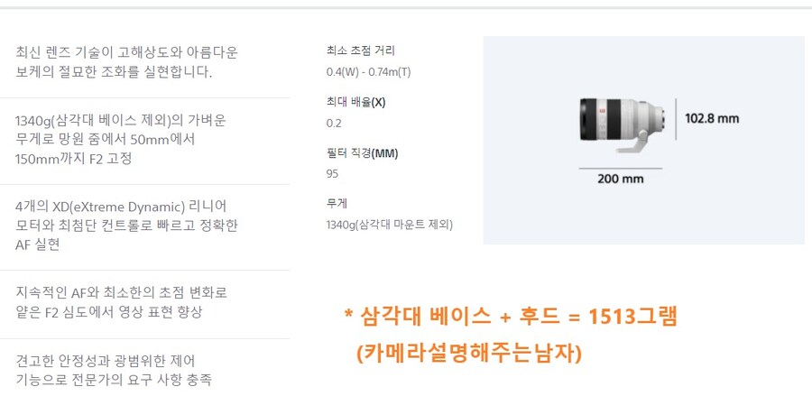 50-150GM은 삼각대 다리를 쓸 수 있는 렌즈인데, ‘사진찍는회계사’님 왈, 삼각대 다리와 줌링 사이의 공간이 협소해서 조작이 불편하다는 평을 남겨주셨어. (삼각대 다리를 빼고 사용하면 문제 없음)
