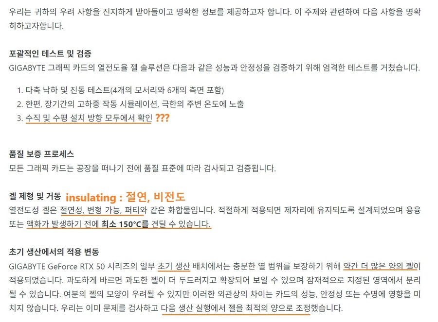 기가바이트여, 그런데 왜 써멀젤 누출 문제가 생겼는가? 그래픽카드를 수직으로 설치했을 때마저 확실히 안정성을 확인했는가? 150도까지 견딘다는 써멀젤이 왜 벌써부터 액화되어 스멀스멀 흘러내렸는가? 해명하시오. (...)