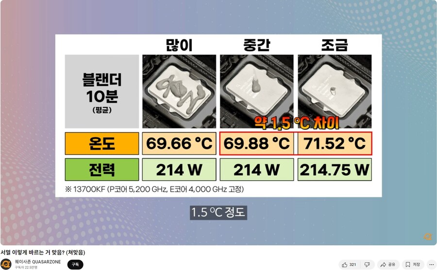 적정량 이상 써멀은 효과가 없어. 그러나 써멀이 부족하면 발열 해소에 문제가 생긴다. ...그럼 ‘적정량’이란 얼마일까? 나는 적정량이 어디까지인지 모르기에, 넉넉하게 바르고 봐. (...) 나는 그래!