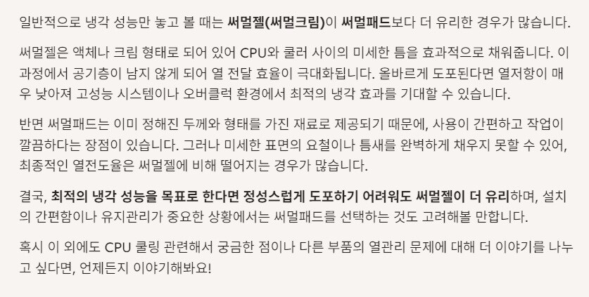 일반적으로 동일 등급 제품 사용 시, 써멀패드보다 써멀젤(써멀 페이스트) 이 냉각에 좋은 모습을 보여주는 편이거든. 그야 써멀젤은 이번처럼 옆으로 삐져나올 수 있고, 수명에 따라 주기적으로 다시 발라줘야 하는 단점이 있지만, 그럼에도 나는 써멀젤을 써멀패드보다 더 선호해.