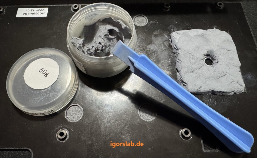 핫스팟 인근 백플레이트(Back Plate)에 구멍을 냈어. 더해 구멍 근처에 써멀 퍼티(Putty, 접합제. 써멀 젤 < 써멀 페이스트 < 써멀 퍼티 순으로 점성이 높음?)를 두둑하게 발랐어.
