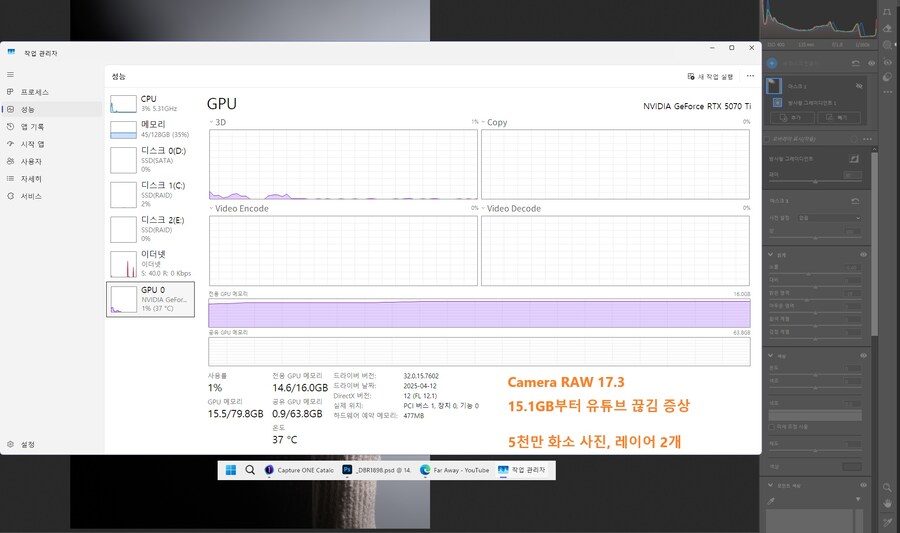 비디오램 사용량이 15.1GB에 달하니까, 카메라로우에서 수치 하나 바꿀 때마다 유튜브 영상이 순간적으로 끊어지더라고. 현타가 올 지경이었어. 내가 이 꼴 보려고 5070 Ti로 바꿨나! (다행히 카메라로우를 끄는 즉시 비디오램 사용량 급감)