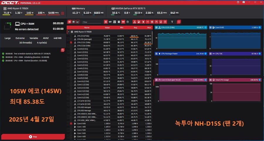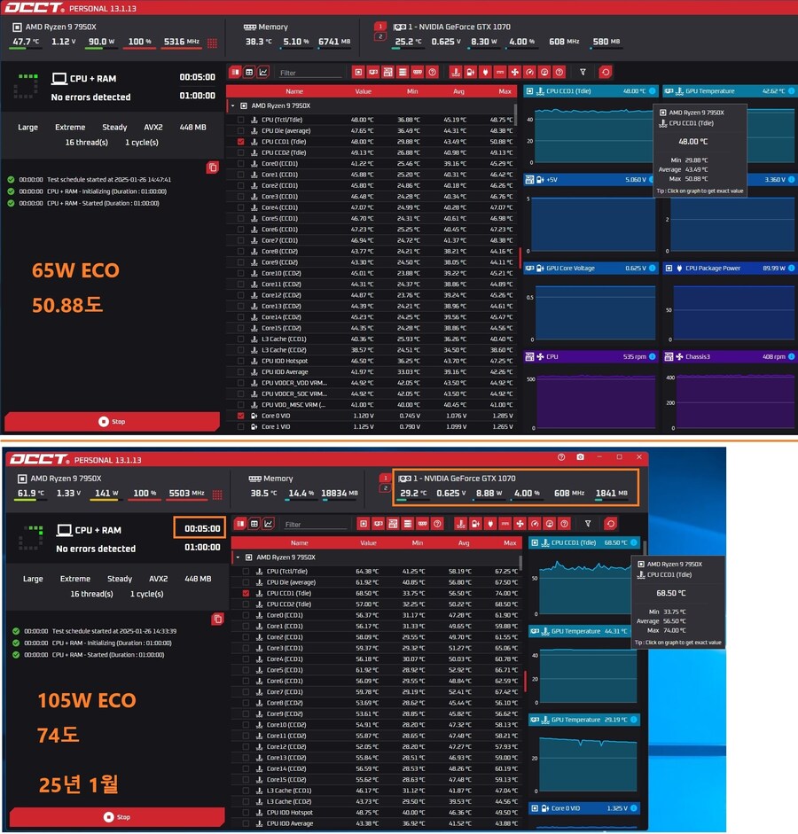 나는 간과했던 거야. 예전에 내가 105W 에코 모드를 측정했던 당시는 겨울이었음을. OCCT를 5분밖에 안 돌렸음을. 더해 당시 그래픽카드는 1070. 현재는 5070 Ti. 그래픽카드 또한 CPU 온도에 영향을 주었을 거야. 어쨌든, 봄날에도 이럴지 언데, 무더운 여름이면 컴퓨터가 뜨끈팔팔 끓겠다. 에어컨을 틀지 않는 내가 과연 저 불덩이 컴퓨터를 감당할 수 있을까? 안 된다! 온도 낮춰야 한다!