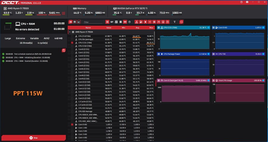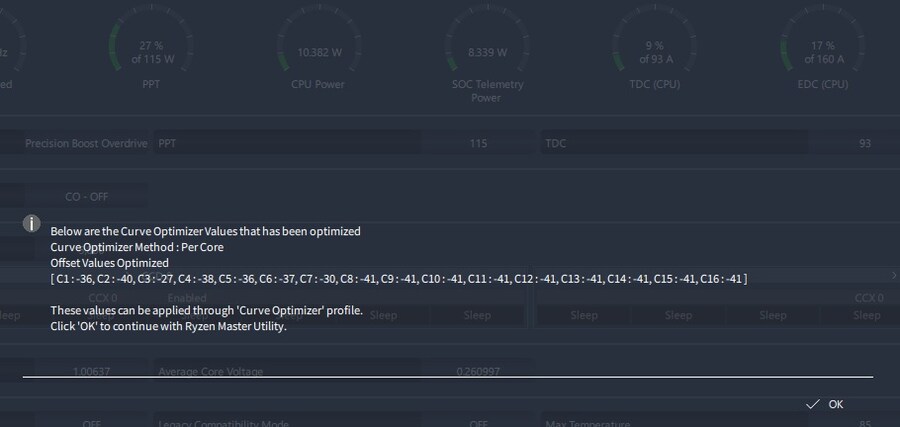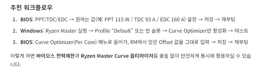 PPT 115W, TDC 93A, EDC 160A. 해당 값으로 문제없이 CPU를 구동시킬 수 있었고, ‘라이젠 마스터’에서 ‘커브 옵티마이저(전력 곡선 최적화)’ 수치까지 구했어.