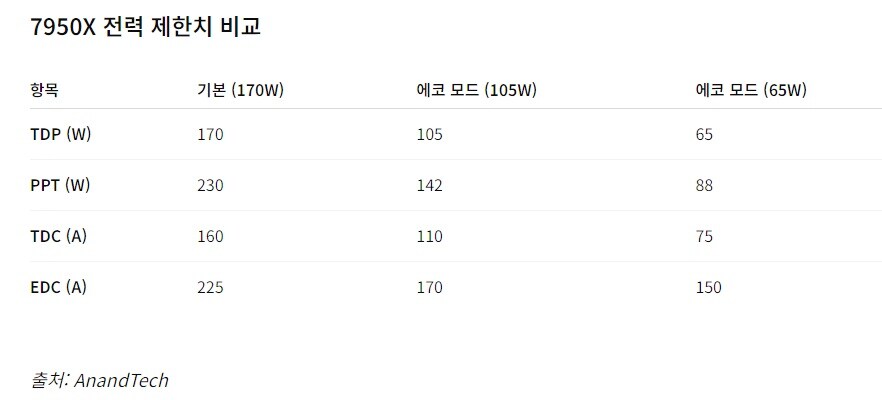 최근까지 나는 AMD 7950X를 65W 에코모드(TDP 65W로 전력제한)로 쓰고 있었어.