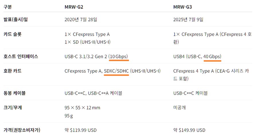 MRW-G2에 비해 4배 빠른 40Gbps 대역폭을 확보했으며, 대신 G2는 CFE A와 더불어 SD까지 읽을 수 있는 반면 G3는 오직 CFE A만 읽을 수 있어.