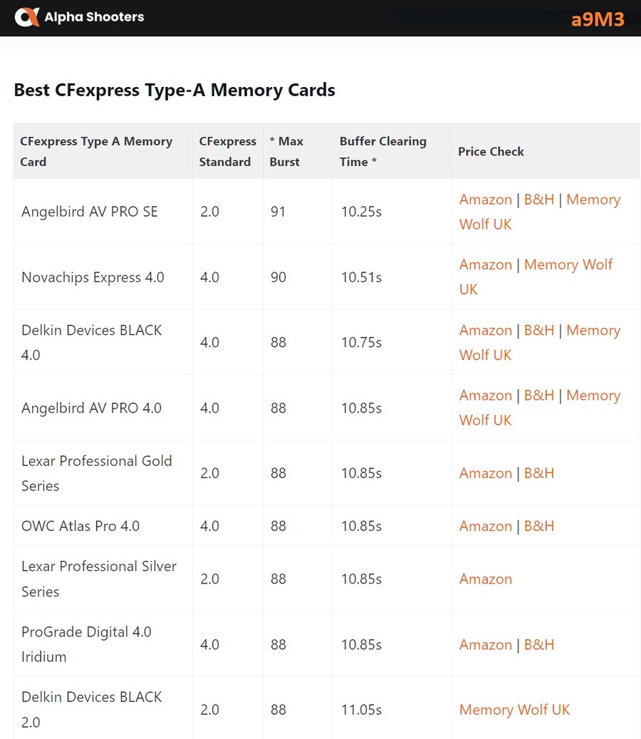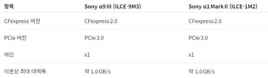 소니의 최신 기함 카메라, a9M3와 a1M2. 둘 다 CFexpress 2.0이야. 아무리 여기에 CFE 4.0 메모리카드를 꼽는다 한들 카메라 내부 대역폭 때문에 한계에 부딪혀. Alpha Shooters에서 측정한 자료.