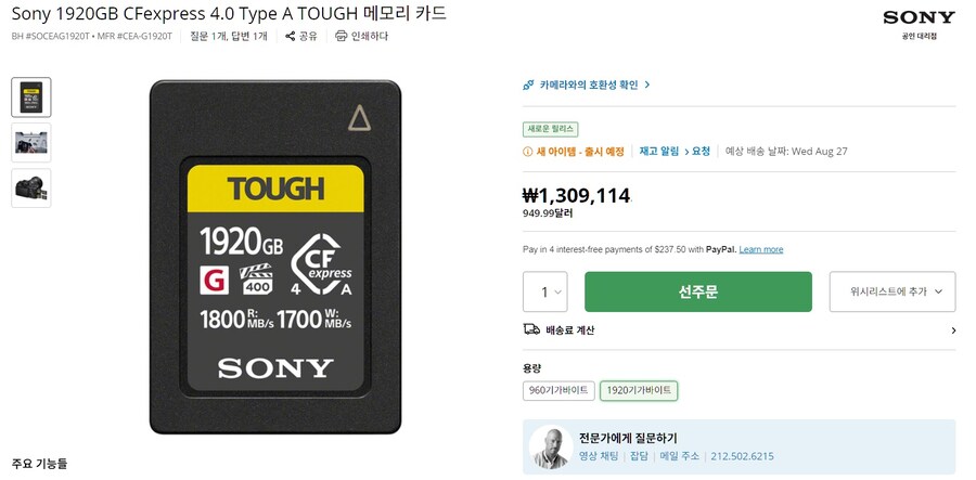 1920GB 기준 949.99달러로 한화 130만 원가량. 물론 비싸지. 하지만 기존 소니 1920GB ‘M’ 카드가 199만원인 걸 감안하면, 소니치고 저렴하게 나온 것 같아.