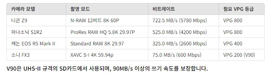 니콘과 파나소닉은 VPG 800급의 메모리카드를 요구해. 단 니콘 카메라는 VPG 등급을 따지지 않기 때문에, 메모리카드의 실제 지속쓰기 성능만 722.5MB/s를 넘으면 8K 60P N-RAW 촬영을 할 수 있어. (파나소닉은 VPG 인증을 따지는지 모르겠습니다!)
