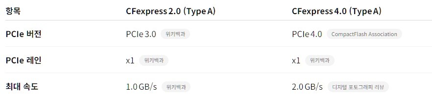 CFexpress 2.0에 비해 4.0이 2배의 대역폭을 가져. CFexpress 2.0 다음 3.0이 아니라 4.0이라 명명한 이유, PCIe 버전과 CFexpress 버전 명칭을 통일시켜 소비자 혼선을 줄이기 위함이래.