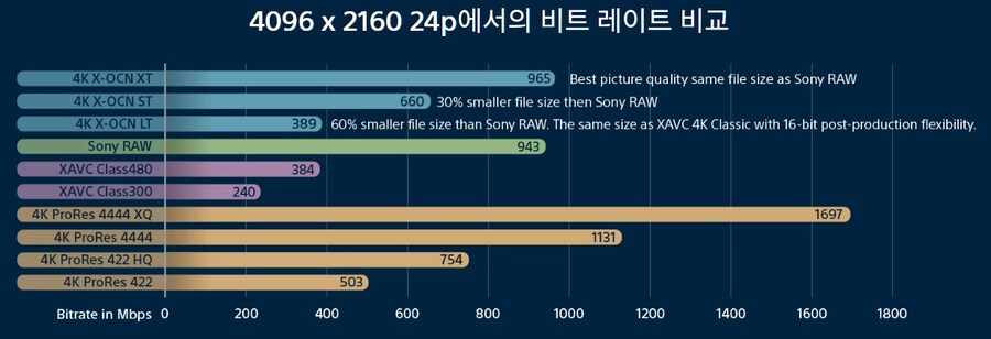 신형 메모리카드가 VPG 800이 아니라서 아쉬워. 만약 이번에 소니가 VPG 800을 내놨다면, 향후 소니 카메라에 8K RAW 영상 촬영이 가능해 질지도 모르거든. 가령 각 회사 촬영 모드 별 비트레이트.