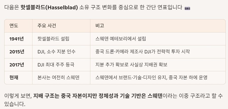 핫셀블라드는 스웨덴 기업이었지만, 2017년 이후 DJI가 최대 주주로 등극하면서 중국 자본 아래로 들어갔구나.