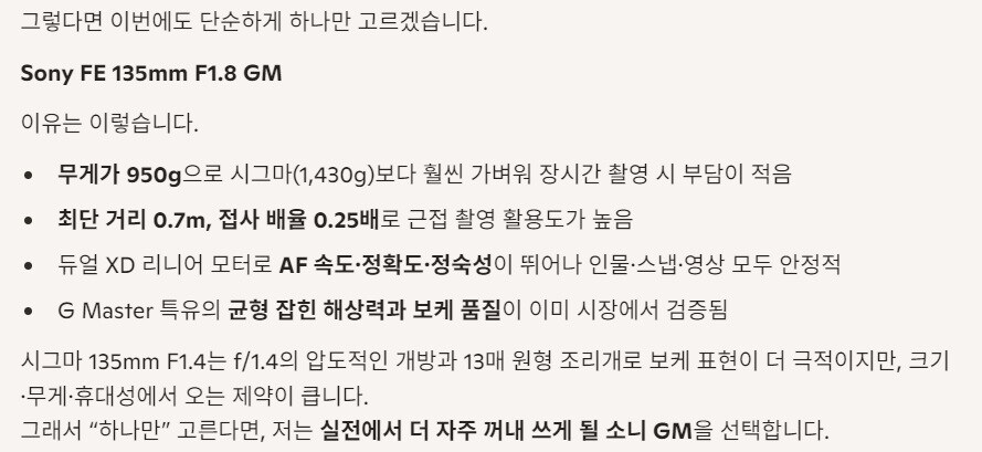여러분은 시그마 135mm F1.4와 소니 135mm F1.8 중에 어떤 제품이 더 끌려? AI는 소니 135 GM을 선택했어.