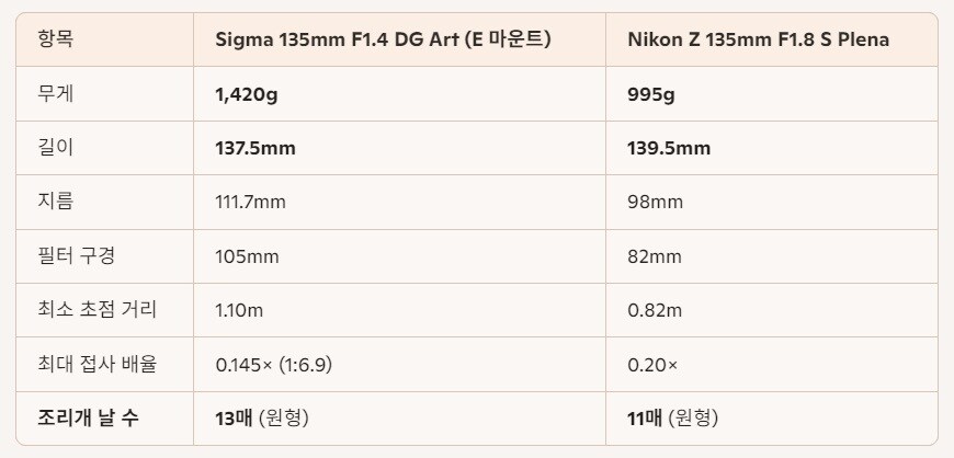 시그마 135mm F1.4 DG ART를 소니 니콘 135mm F1.8 렌즈와 비교하며 장단을 따져봤어. 먼저 소니 135mm F1.8 GM과 비교.