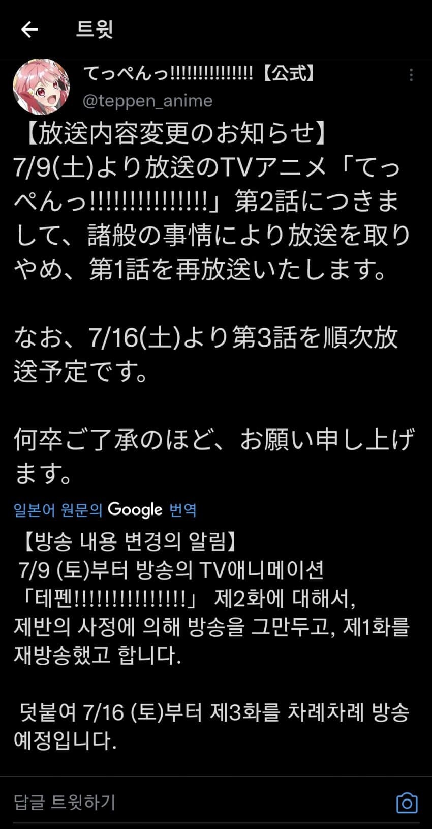 이번 분기 신작 애니 '텟펜' 2화가 갑작스럽게 결방