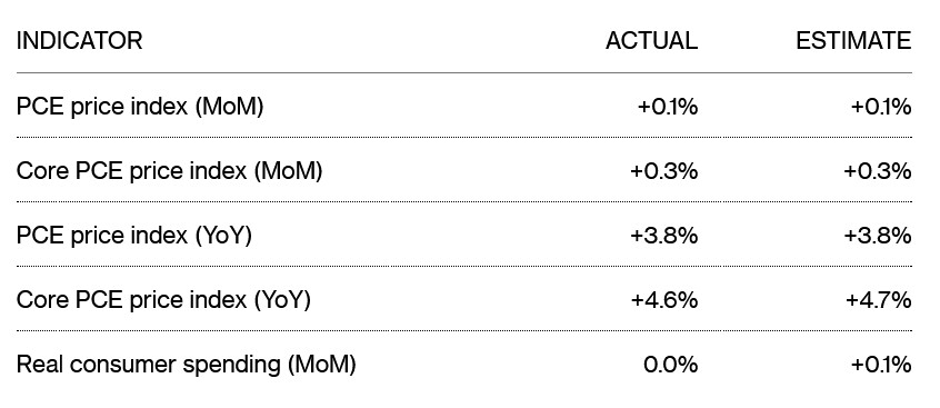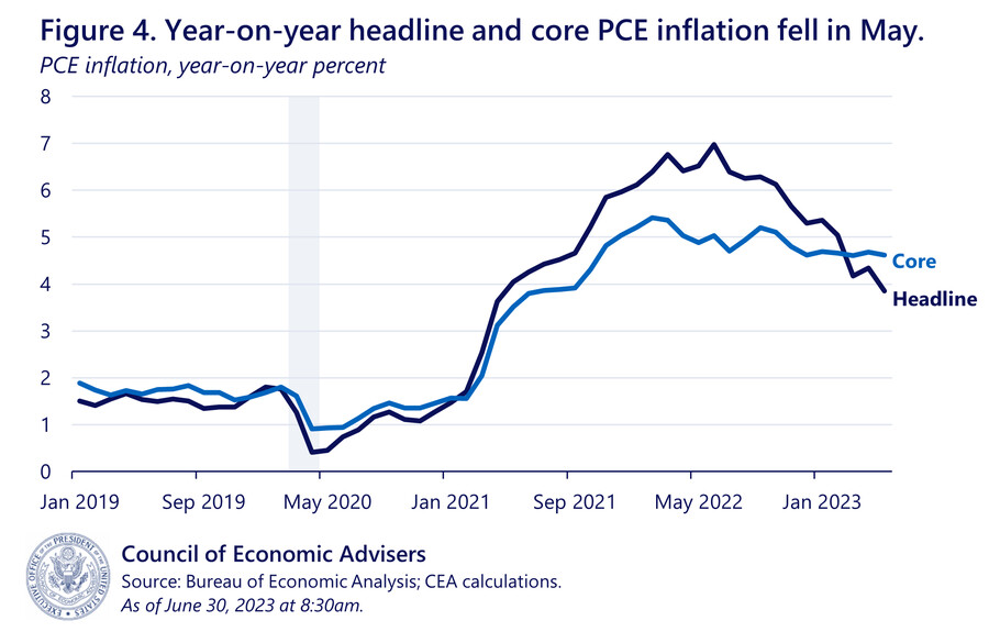 오전 8시 30분 발표된 5월 PCE 물가는 헤드라인 수치가 전월보다 0.1% 오르고, 지난해 같은 기간보다는 3.8% 상승한 것으로 나타났습니다. 3.8%는 2021년 4월 이후 가장 낮은 것입니다. 5월(0.4%, 4.3%)에 비해 상당 폭 둔화했고, 예상(0.1%, 3.8%)과는 같았습니다.