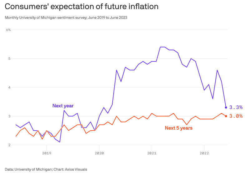 오전 10시 발표된 6월 미시간대 소비자심리지수 최종치는 이런 상승세에 힘을 보탰습니다. 2주 전 발표된 6월 예비 측정치는 63.9였는데 최종치는 64.4로 더 높아졌습니다. 4개월 만에 가장 높습니다. 현재 여건 지수는 69(예비치 68), 기대 지수는 61.5( 61.3)로 개선됐습니다. 또 1년(단기) 인플레이션 기대치는 3.3%로 5월 4.2%보다 뚝 떨어진 것으로 최종 집계됐습니다. 예비치와 같았습니다. 5년(장기) 인플레 기대치는 3%로 5월보다 0.1%포인트 둔화했습니다.