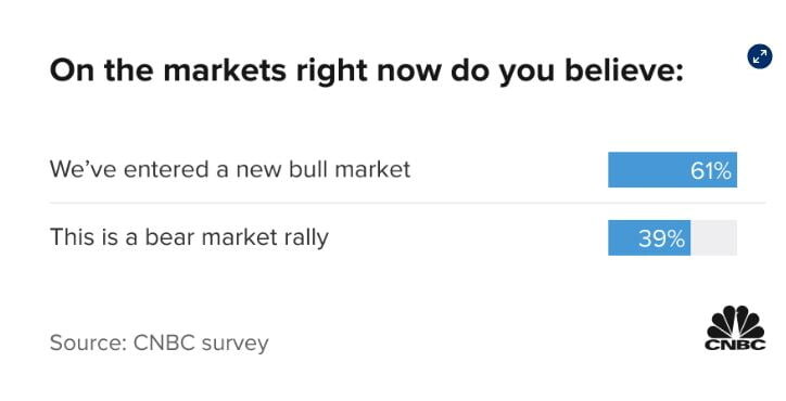 '지금이 강세장이냐 약세장이냐' 묻자 61%는 새 강세장이 시작됐다고 답했습니다. 39%만이 베어마켓 랠리라고 응답했고요.