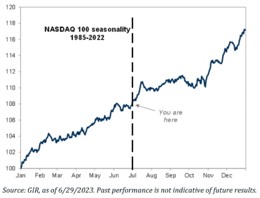 골드만삭스 트레이딩 데스크는 1928년부터 1년을 15일 단위로 끊어보면 7월의 첫 보름 동안이 가장 수익률이 좋다고 밝혔습니다. 그리고 7월 17일부터 상승 모멘텀이 꺾인다고 설명했습니다. 나스닥 지수의 경우 2008년 글로벌 금융위기 당시를 포함해 지난 15년간 연속으로 7월에 상승했다고 지적했습니다.