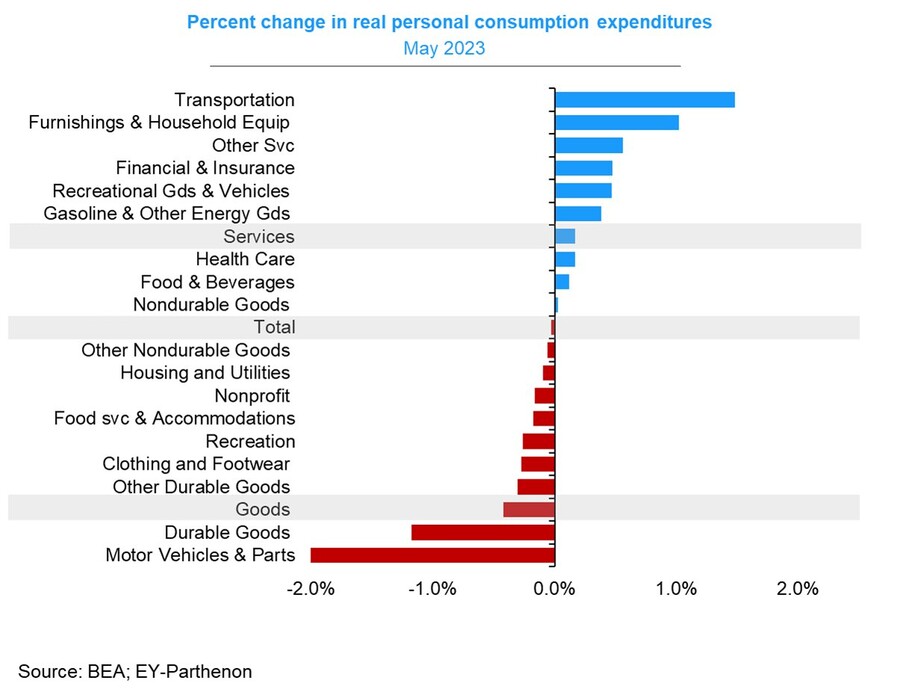 게다가 지출을 보면 '명목' 개인소비지출은 전월 대비 0.1% 늘었고 4월 수치는 0.8% 증가에서 0.6% 증가로 하향 조정되었습니다. 물가를 고려한 '실질' 소비지출은 5월 0%, 4월 0.2% 증가에 그친 것이죠. 하이프리퀀시 이코노미스트의 루빌라 파루키 이코노미스트는 "Fed 관점에서 소비 둔화는 인플레이션 둔화와 마찬가지로 반가운 소식이 될 것"이라고 말했습니다. 미국인들은 의료, 항공 여행과 같은 서비스에 더 많이 쓰고 자동차 등 상품에 더 적게 지출한 것으로 나타났습니다.