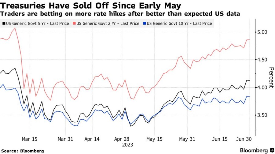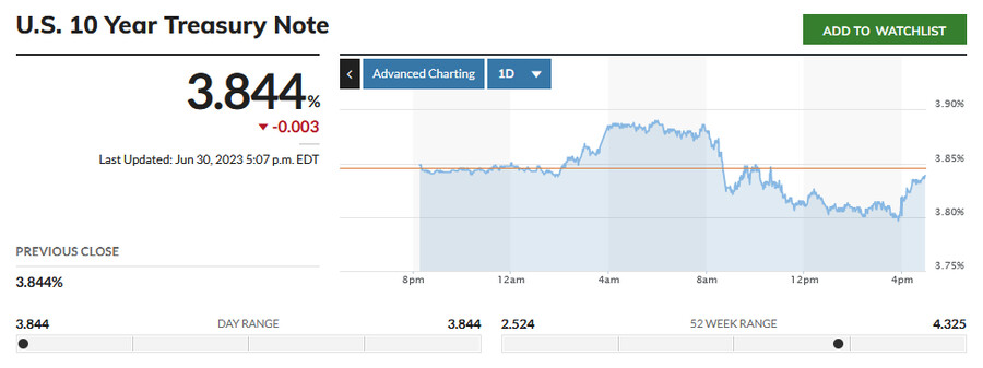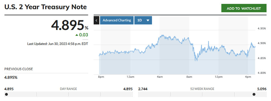오늘 뉴욕 채권시장에서 금리는 PCE 물가가 나온 뒤 하락했지만, 단기물은 다시 상승했습니다. 오후 5시께 국채 2년물 금리는 3.0bp 오른 4.895%에 거래됐지만 10년물은 0.7bp 내린 3.839%를 기록했습니다. 월가 관계자는 "GDP도 좋게 나오고 근원 물가가 높게 나온 데 대한 걱정이 있다. 그래서 펀더멘털을 보면 금리가 올라가야 하는데, 오늘은 6월 마지막 날이어서 월말 효과와 리밸런싱 등 기술적 요인으로 인해 장기물 수익률은 약간 하락했다"라고 설명했습니다.