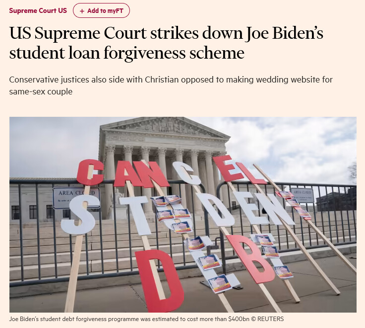 주요 지수는 질주했습니다. 오후 11시께 미 대법원이 조 바이든 행정부의 학자금 대출 탕감에 제동을 걸었다는 소식이 나온 뒤 잠시 주춤했습니다. 바이든 대통령은 지난해 8월 연 소득 12만5000달러(부부 합산 25만 달러) 미만 가구를 대상으로 최대 2만 달러까지 학자금 빚을 면제하겠다고 발표했죠. 4300억 달러가 소요되는 정책입니다. 의회 통과 가능성이 낮자 행정부가 독자적으로 실시하기로 했죠. 이에 대해 대법원은 6대3 의견으로 의회 승인을 필요하다고 판결했습니다.