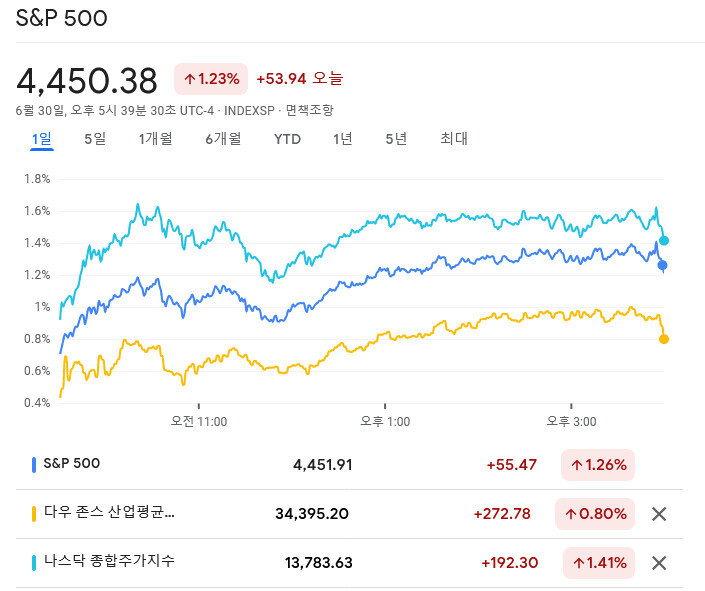 상반기 마지막 거래일인 30일(미 동부시간) 미국 경제의 연착륙 희망은 더 커졌습니다. 전날 1분기 국내총생산(GDP) 증가율이 연율 2%에 달해 탄탄한 성장을 지속하고 있는 것으로 나타난 가운데, 오늘은 5월 개인소비지출(PCE) 인플레이션이 예상보다 부드럽게 나왔습니다. 연착륙을 확신한 투자자들은 주식 매수에 뛰어들었고, 그야말로 금요일 불장이 펼쳐졌습니다. 뉴욕 증시가 강세장에 들어갔다는 주장은 이제 컨센서스가 되었습니다. 오늘 급등으로 S&P500지수는 올해 들어 16% 오른 채 상반기를 마무리했습니다. 6월에 6.5% 상승해 2022년 10월 이후 최고의 달을 보냈습니다. 나스닥 종합지수는 올해 32% 뛰어 1983년 이후 최고의 상반기 실적을 기록했습니다.