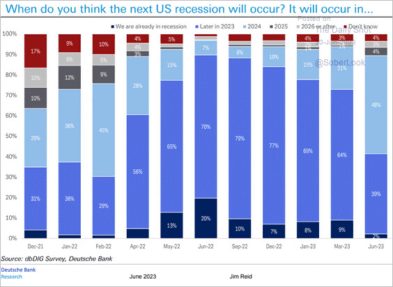 이는 도이치뱅크 설문조사에서도 마찬가지입니다. 이코노미스트 대상 조사에서 침체가 곧 올 것이라고 본 사람은 1년 전 90%에서 이번 주 41%로 떨어졌습니다.