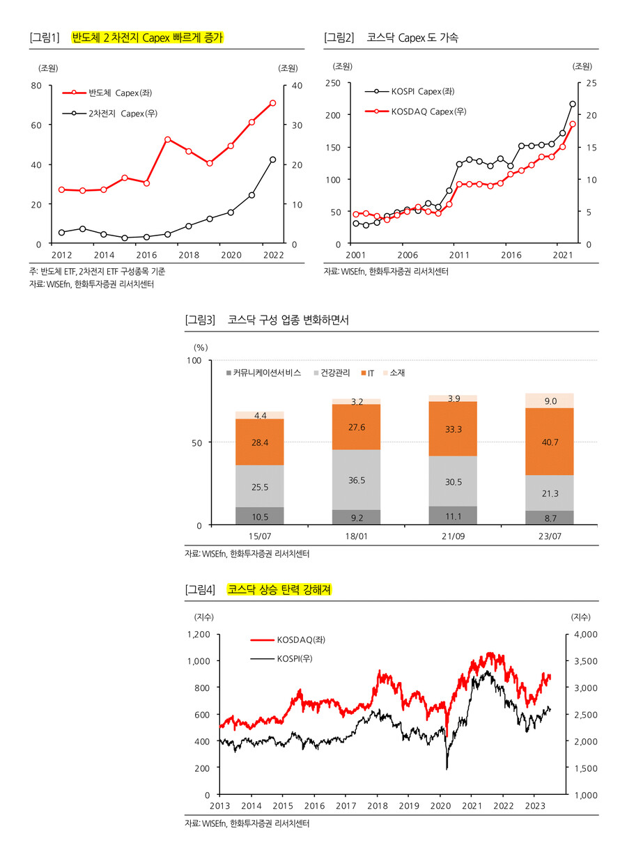 상반기 대형주의 성공은 하반기 중소형주의 성공 확률을 높여주고 있다고 생각한다. 대형주와 중소형주의 연결고리는 Capex와 지수 구성이다. KOSPI 기업들의 투자가 본격적으로 늘어난 건 2017년부터다. 이때부터 코스닥 기업들도 투자에 속도를 내기 시작했다. 최근 코스닥지수의 상승 속도가 KOSPI보다 빠른 건 업종 구성을 반영한다. 코스닥지수는 2015년만 해도 헬스케어, IT의 비중이 높았지만 IT가 40.7%, 2차전지 소재를 포함하는 소재가 9.0%까지 상승했다.