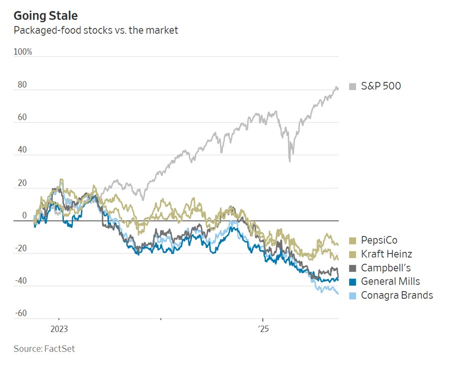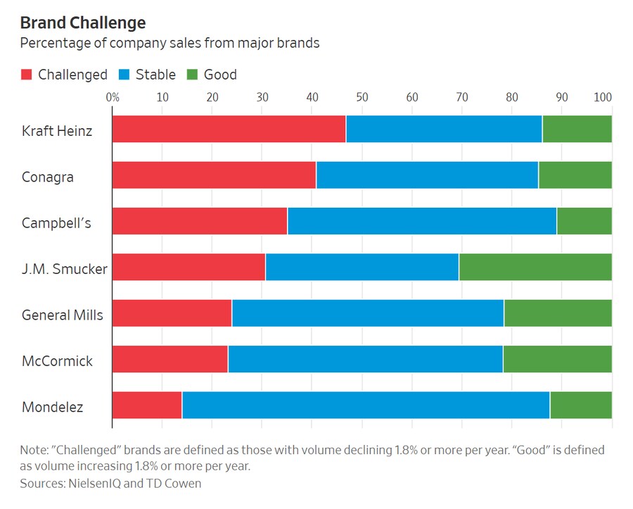 수년간 인플레이션을 웃도는 가격 인상을 단행하면서도 브랜드의 신선함을 유지하는 데는 충분한 주의를 기울이지 않았던 대형 식품 기업들은 이제 딜레마에 직면했습니다. 캠벨, 네슬레, 펩시코, 제너럴 밀스 등을 포함한 기업들의 주가는 S&P 500 지수가 약 80% 상승하는 동안 지난 3년간 하락했습니다.