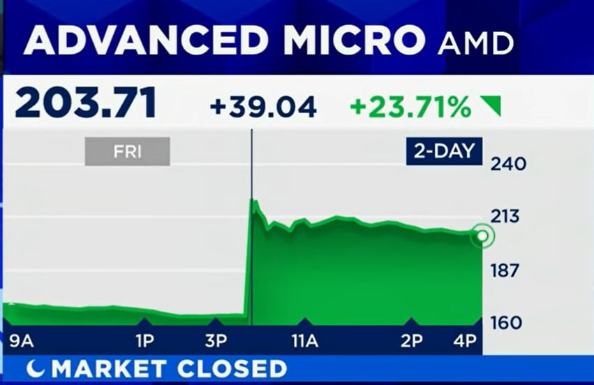 • 주가 반응: 이 소식으로 AMD 주가는 장중 한때 38%까지 폭등했으며, 최종적으로 23.71% 상승 마감했습니다.