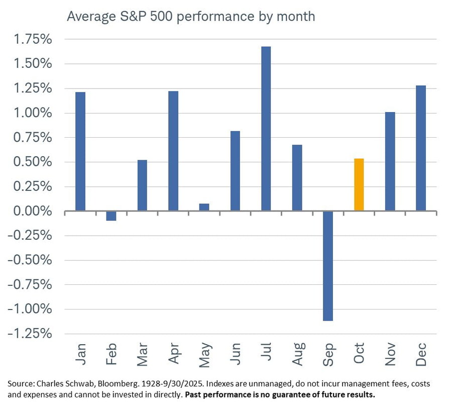 10월은 역사적으로 수익률이 긍정적이지만, 동시에 연중 변동성이 가장 큰 달이기도 했는데요. 비스포크인베스트먼트에 따르면 S&P500 지수는 지난 75년 동안 10월에 평균 0.9% 수익률을 기록했지만, 최고와 최저 수익률 차이는 8.3%포인트에 달합니다. 이에 대해 골드만삭스는 "지난 50년을 보면 10월이 극도로 변동성이 컸던 경우가 딱 두 번 있었다. 1987년 블랙먼데이와 2008년 글로벌 금융위기 때다. 이 두 사례를 제외하면 10월은 달력상 변동성(outlier)으로 보기 어렵다"라고 밝혔습니다.
