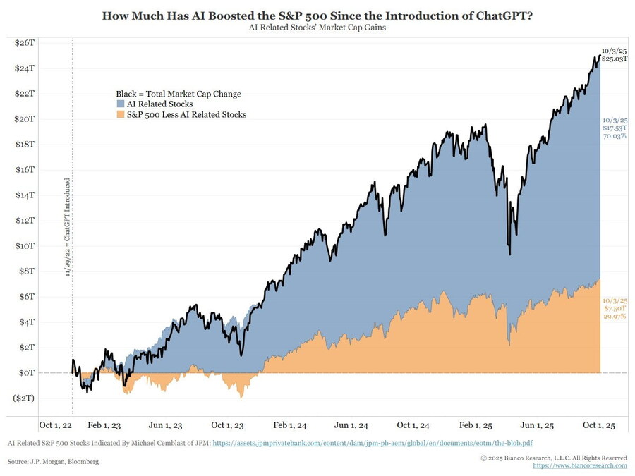 챗GPT 출시 이후 S&P 500 시가 총액 증가분 중 AI 관련주의 비중이 70%에 달함