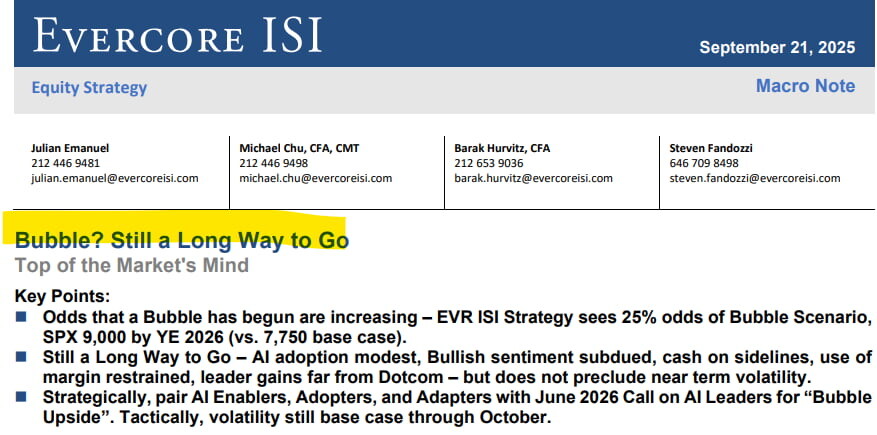 이렇게 버블을 얘기하는 사람들의 공통점은 지금 터진다는 게 아닙니다. 앞으로 터질 수 있다는 것이죠. 그래서 지금은 투자하라는 게 핵심입니다. 에버코어ISI가 대표적인데요. 에버코어의 기본 전망은 S&P500 지수가 내년 말까지 7750에 도달하는 것인데요. "'거품' 시나리오대로라면 S&P500은 2026년까지 9000까지 치솟을 수 있다"라고 합니다. 에버코어는 거품 시나리오 가능성을 30%로 제시합니다.